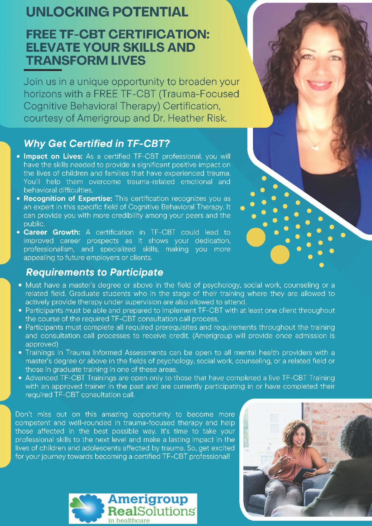 Trauma-Focused Cognitive Behavioral Therapy Certification: Professionals working with children and young adults are invited to participate in a FREE, virtual Trauma-Focused CBT certification training, sponsored by Amerigroup. This evidence-based training equips participants with skills to support children and adolescents (ages 3–18) impacted by trauma. The training will take place virtually from April 22–25, 10AM-3PM, and includes 16 CEUs, 12 consultation calls, and practical case discussions. Participants must complete an online prerequisite course through MUSC and begin reading Treating Trauma and Traumatic Grief in Children and Adolescents by Cohen, Mannarino, and Deblinger prior to the training. To register, visit the registration form. For more information, contact Andrea Elam at andrea.elam@amerigroup.com.
