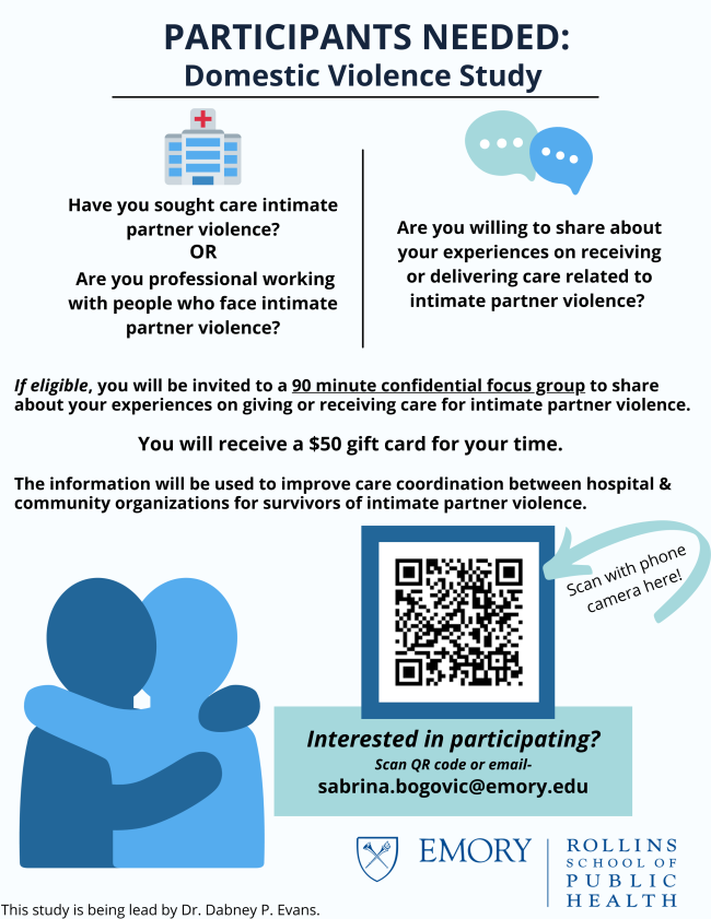 Participants Needed! Domestic Violence Study: Dr. Dabney Evans at Emory University is seeking participants for a research study examining care coordination between hospital and community organizations for survivors of intimate partner violence (IPV). Eligible participants have sought care for IPV or work with people who face IPV and will be invited to participate in a 90-minute confidential focus group to share your experiences giving or receiving care for IPV. Study participants will receive a $50 gift card for your time. Register here.