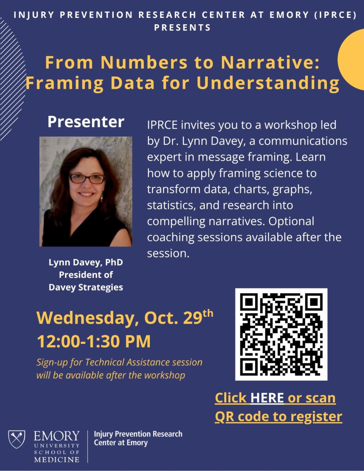 Workshop: From Numbers to Narrative: Framing Data for Understanding: The Injury Prevention Research Center at Emory is hosting a workshop, “From Numbers to Narrative: Framing Data for Understanding,” led by Dr. Lynn Davey, President of Davey Strategies and expert in communications and message framing. This event is virtual from 12-1:30 PM on October 29th. Register here.